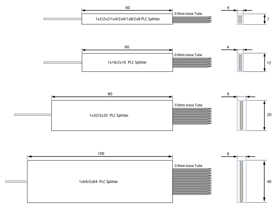The Bare Fiber PLC Splitters is branching devices that is used to distribute optical signals to multiple locations for processing. In optical networks, it is often necessary to split an optical signal into many identical signals, or to combine many signals into a single signal. PLC Splitter (Planar lightwave circuit splitter) is a type of optical power management device that is fabricated using silica optical waveguide technology. They are designed for FTTx Passive Optical Networks, CWDM, DWDM and optical cable TV System. PLC Splitter is responsible to distribute optical signals from Central Office (CO) to multiple premise locations.We provides whole series of 1*N and 2*N splitter products that are tailored for specific applications.